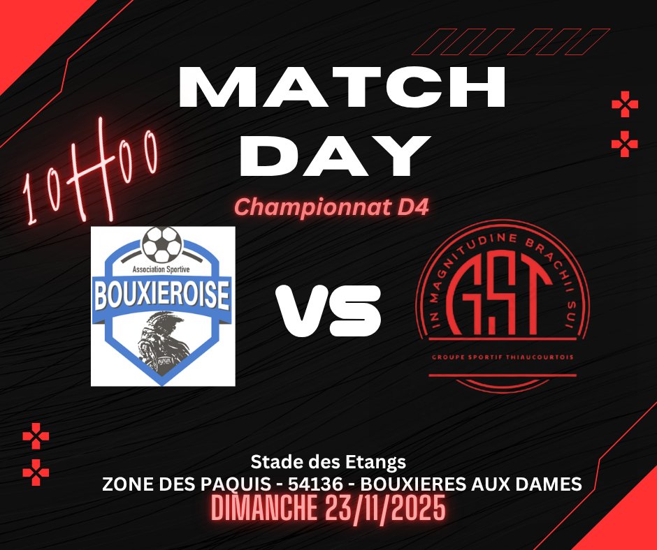 Le championnat D4, GST Thiaucourt contre AS Bouxieroise, aura lieu au Stade des étangs de Bouxières aux dames à 10h00.