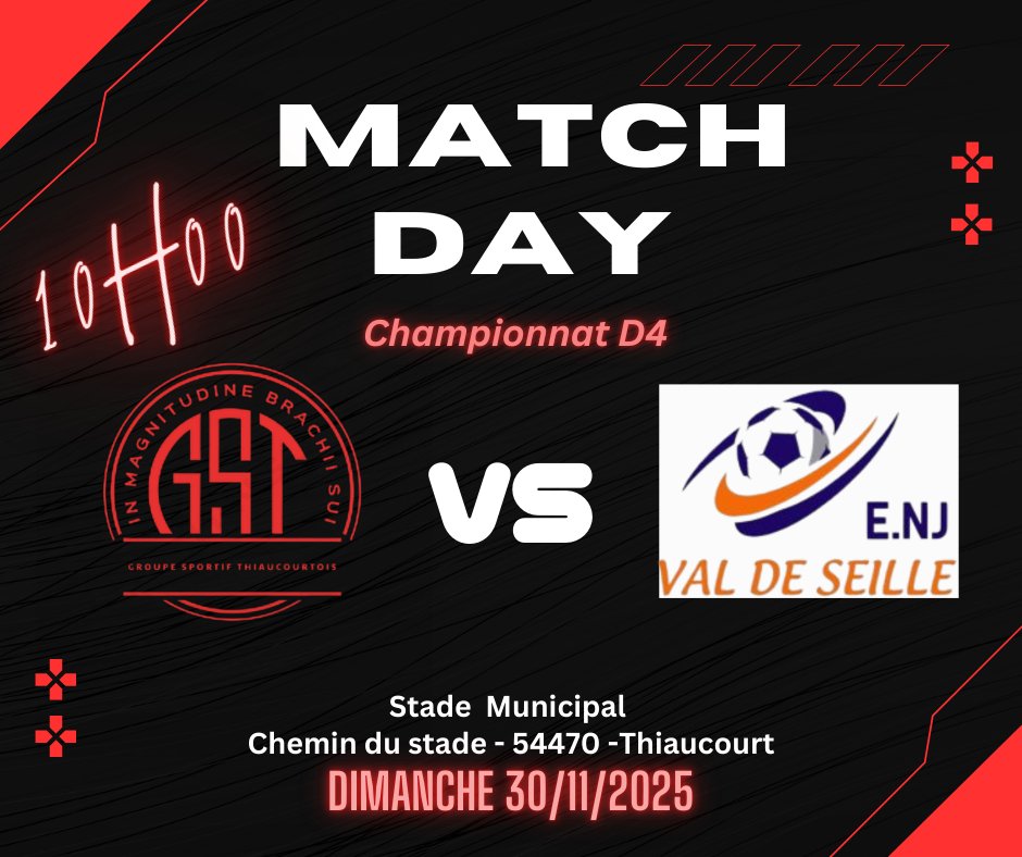 Le championnat D4, GST Thiaucourt contre E.NJ Val De Seille, aura lieu au Stade municipal de Thiaucourt à 10h00.