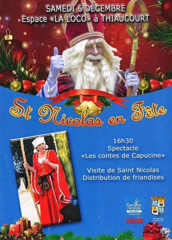 le samedi 06 décembre, la salle La Loco accueillera un invité de marque ! En effet, après un spectacle à 16h30 où Capucine vous fera part de ses meilleurs contes, Saint Nicolas en personne viendra visiter les enfants de Thiaucourt et distribuer des cadeaux !