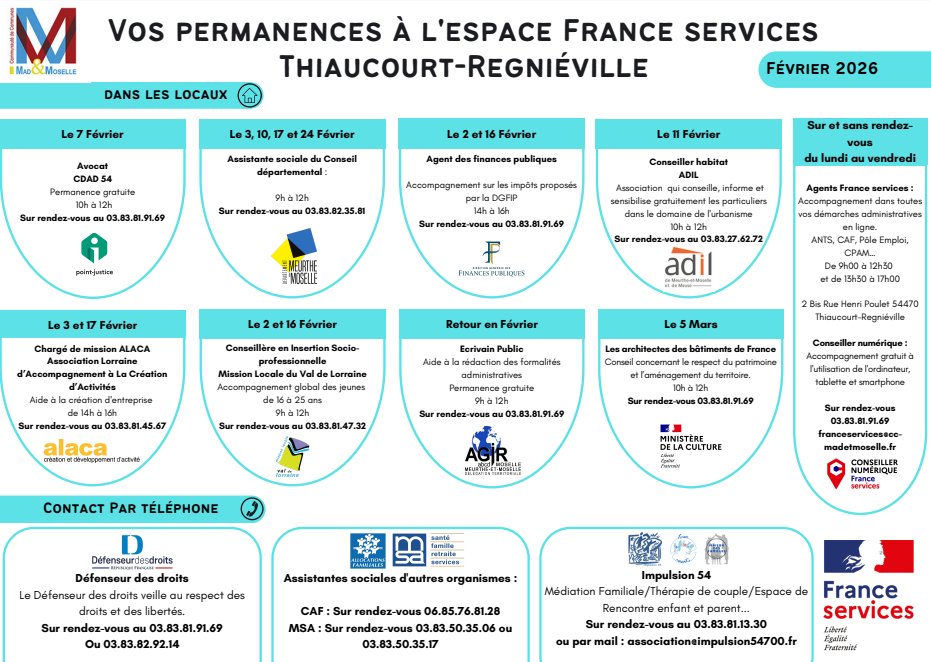 Vous trouverez ci-joint les permanences de janvier 2026 des espaces France service d'Ancy-Dornot et de Thiaucourt-Regniéville.