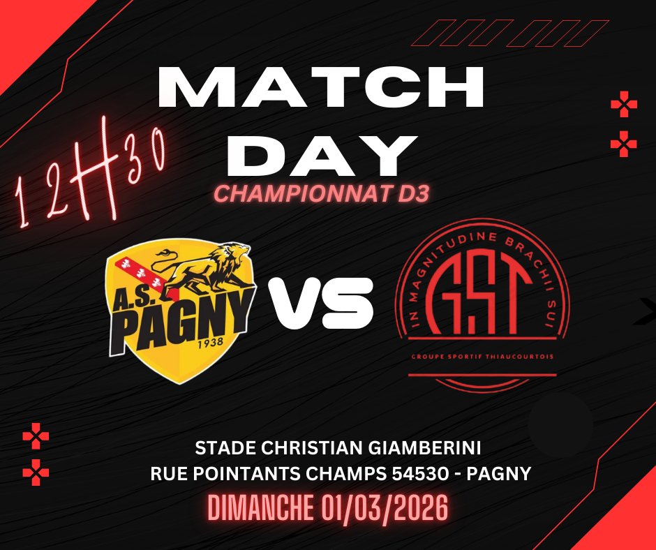 Le championnat D3, GST Thiaucourt contre A.S. Pagny, aura lieu au Stade Christian Giamberini à Pagny pour 12h30.