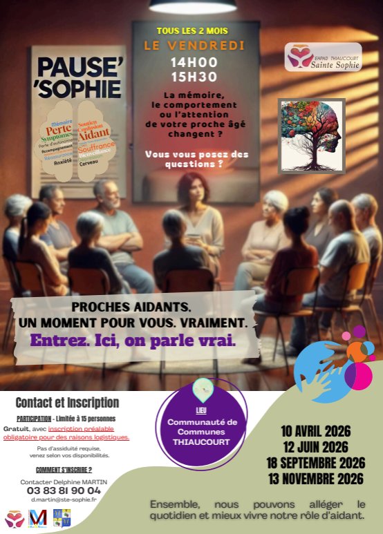 L'EHPAD Sainte Sophie propose un rendez-vous tous les deux mois à la Communauté de Communes, ces rencontres s’adressent aux proches aidants accompagnant une personne âgée présentant des troubles neuro-évolutifs (maladies neurodégénératives, troubles cognitifs, etc.), résidant sur la commune de Thiaucourt et dans les environs (environ 15 km).
