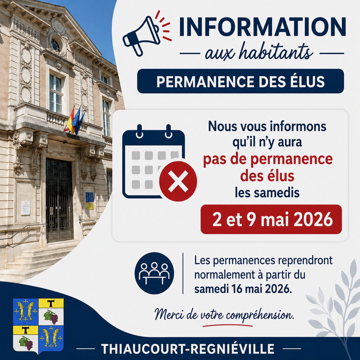 Nous vous informons quâil nây aura pas de permanence des Ă©lus les samedis 2 et 9 mai 2026.