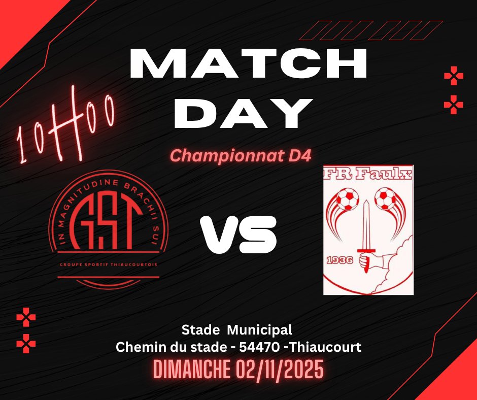 Le premier, le championnat D4, GST Thiaucourt contre FR Faulx, aura lieu au stade municipal de Thiaucourt à 10h.