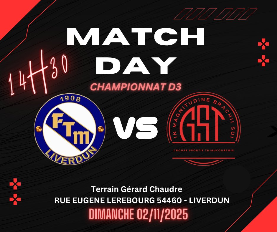 Le second, le championnat D3, FTM Liverdun contre GST Thiaucourt, aura lieu au Terrain Gérard Chaudre à Liverdun à 14h30.