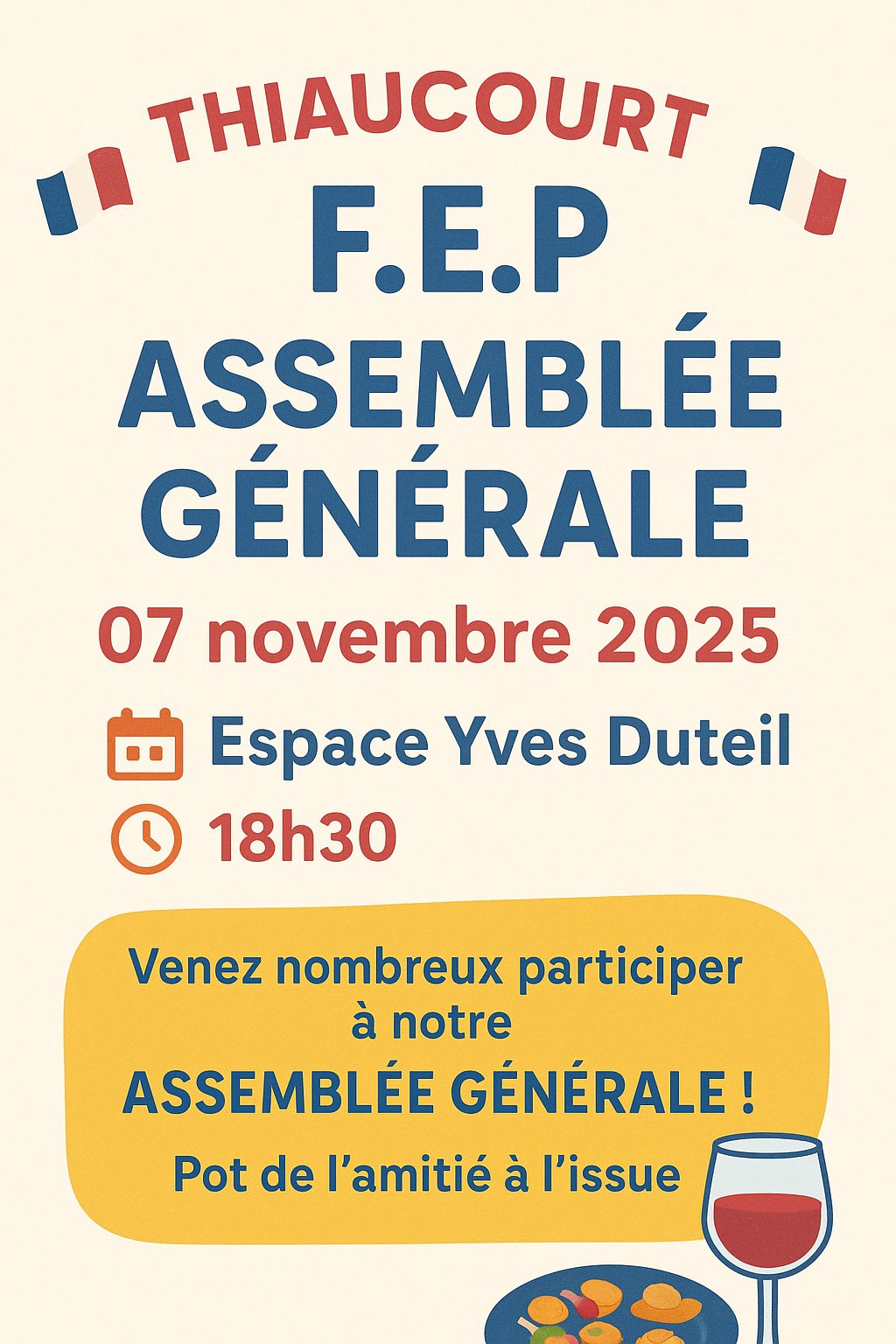L'assemblée générale du F.E.P Thiaucourt aura lieu le 7 novembre 2025 à partir de 18h30 dans l'espace Yves Duteil.