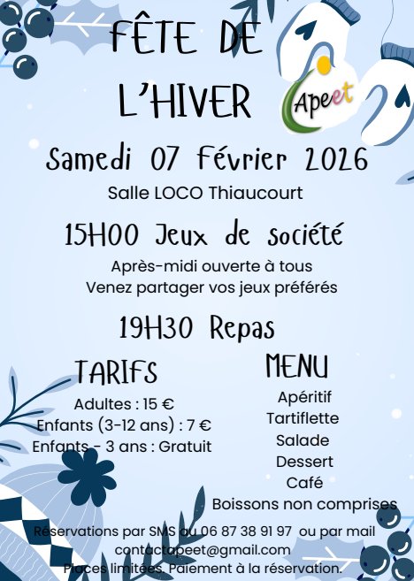 Pour réserver dès maintenant vos places, il suffit de contacter l'APEET par SMS au 06.87.38.91.97 ou par mail à contactapeet@gmail.com