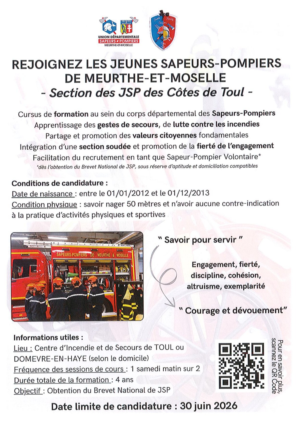 Pour votre information, la section de Jeunes Sapeurs Pompiers fait partie de l'association des JSP des Côtes de Toul, et la section de la caserne de Toul recrute également entre 10 et 15 jeunes avec le même profil.